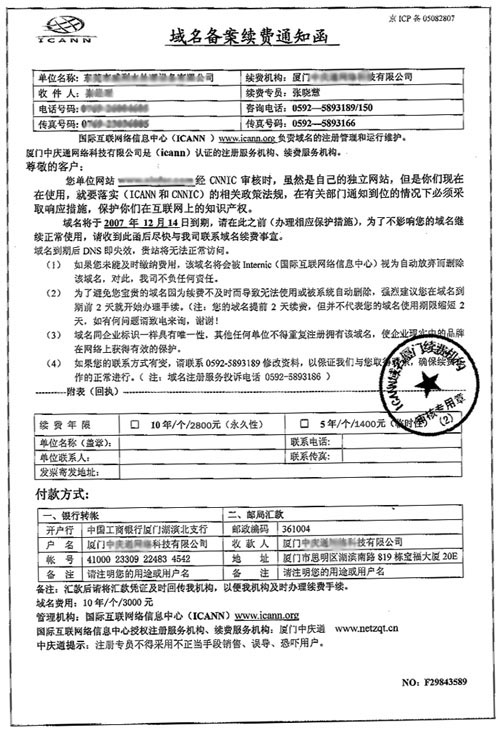 廈門地區(qū)出現(xiàn)的部分不法分子冒充工作人員,以發(fā)傳真或打電話的方式對(duì)客戶實(shí)施欺詐,企圖損害客戶的合法權(quán)益。如果通過了解客戶知道了域名為某某公司注冊(cè)的,而不是在他們廈門公司注冊(cè)的,這些不法分子通常謊稱“某某公司不做了,域名轉(zhuǎn)到他們公司了”或者說“你們這個(gè)某某公司是他們的分公司”等,隨后即要求將域名續(xù)費(fèi)款交到其指定賬戶上。在此,信服科技鄭重提醒廣大用戶留意上述行為,避免上當(dāng)受騙。