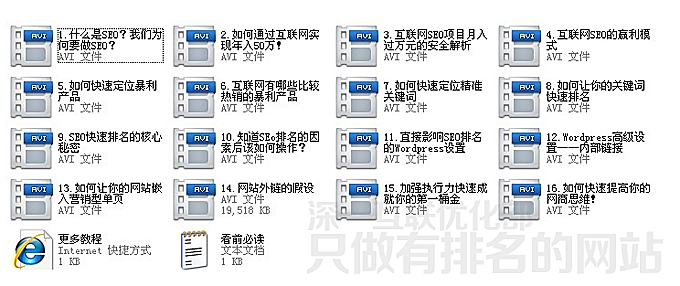 本套深一SEO視頻培訓(xùn)課程包括20部高清視頻+清晰語音+整齊的文本條目,手把手教會快速從主流搜索引擎上獲得排名,從而獲得無限網(wǎng)絡(luò)商機。