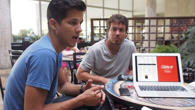 《Vistar》興辦者兼構(gòu)思總監(jiān)羅賓·佩德拉加(左)和他的兄弟、AlaMesa聯(lián)合創(chuàng)始人揚(yáng)戴爾·古鐵雷斯?!禫istar》是有關(guān)古巴年青人文明的電子雜志,AlaMesa是有關(guān)古巴飯館的網(wǎng)站和移動運(yùn)用。