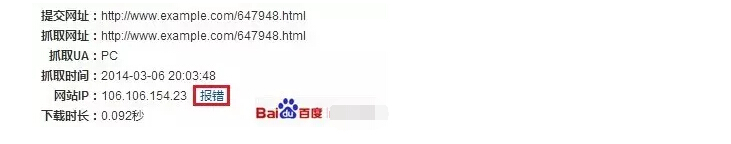抓取診斷工具會(huì)檢查站點(diǎn)與百度的連接是否暢通,若站長(zhǎng)發(fā)現(xiàn)IP信息還是老舊的,可以通過“報(bào)錯(cuò)”通知百度搜索引擎更新IP,如下圖所示: